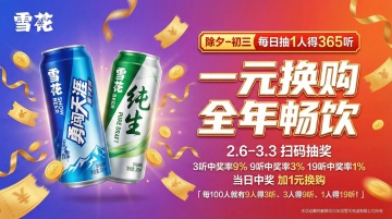 3D微缩艺术风融合虚拟现实场景,冰川溪流环绕青岛啤酒,粒子飞溅营造清爽梦幻感,冲击视觉,传递11.11狂欢预售的激情氛围。