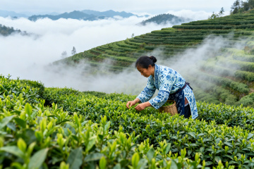 写实摄影风格,清晨薄雾笼罩的层层叠叠绿色茶园,远景为云雾缭绕的山峦,近景是两位戴着传统斗笠的采茶人,一位穿蓝色上衣、一位着浅色传统服饰,手持竹编茶篓和圆形竹匾,正在修剪整齐的茶树行间采茶,整体色调以翠绿、青蓝为主,光线柔和呈漫射状,营造出宁静悠远、自然清新的氛围,展现传统茶文化与田园风光的和谐之美。