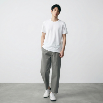 白底图衣服穿到模特身上 无颜色偏差 / 保留细节 场景:灰色地面与白色背景,光线自然,背景简洁 画质要求:写实,8k,高细节,对焦清晰,光线自然,无变形