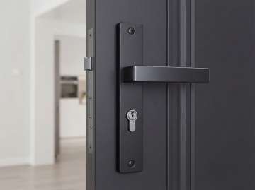 北欧风格室内场景,中央是一扇浅木色的简约实木门,门把为黑色金属材质,门框线条简洁,光线从右侧柔和洒入,在门上形成自然的光影渐变,地面为浅色木质地板,纹理清晰,左侧摆放一个原木色矮柜,柜上有两个白色陶瓷花瓶和一个金属摆件,墙上挂着两幅线条简约的黑白装饰画,右侧是一个同色系的木质储物柜,柜上摆放着插有干花的透明花瓶,整体色调以原木色和白色为主,营造出宁静、自然、温馨的居家氛围,空间布局对称且通透,细节处展现出简约而不失质感的设计美学。