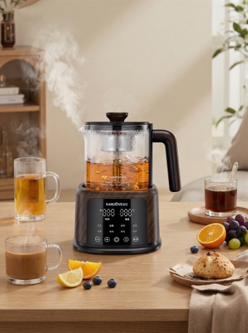 现代感与科技感交融的厨房场景,金属风电饭煲置于大理石台面,搭配清新果蔬与轻拟物设计,营造简约主义下的清爽舒适氛围。