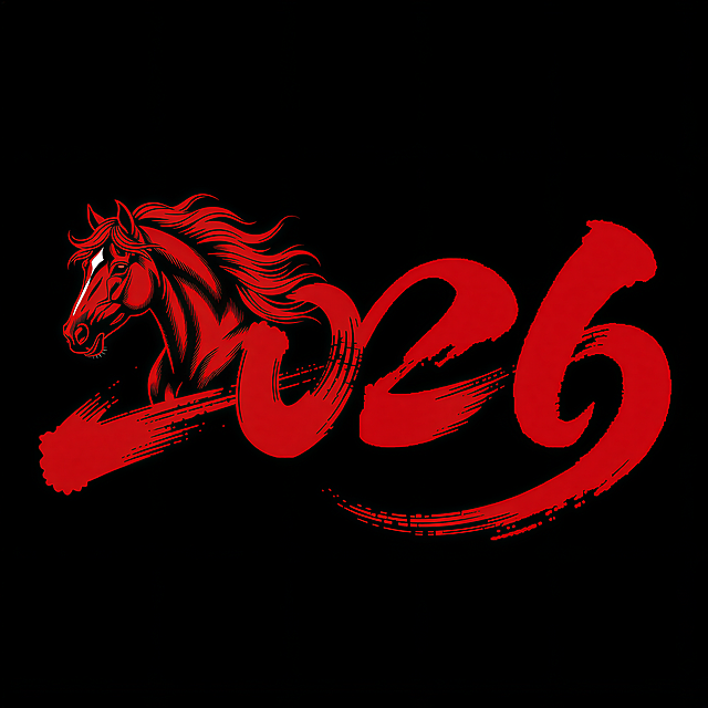 在白色背景上有:“2026” 立体艺术字,连贯的装饰性字体:首个数字 “2” 融合抽象鎏金红昂首嘶鸣马首(马首红底鎏金纹路,鬃毛挺立),红色闪粉与金色金属的材质;金色用于马首鬃毛、字边缘带有金色立体描边,数字表面叠加毛笔笔触纹理,周围点缀细线金色祥云装饰,整体呈现大气、庄重的马年视觉。详情