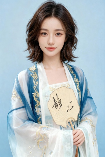 正面照,黑色古风垂挂髻,穿戴学士服学士帽,戴淡粉色刺绣云肩,学士帽旁边簪了粉蓝色的花,背景浅色,暖光
