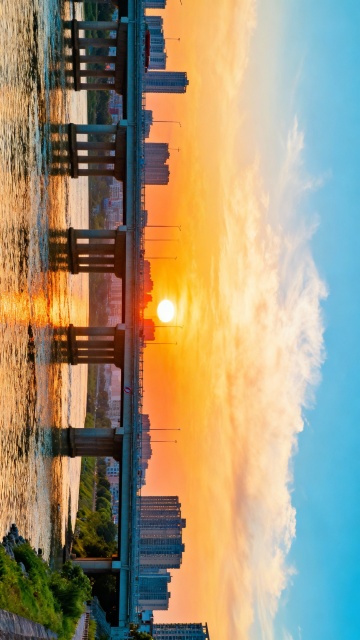 写实风格的日落景象,天空被橙红色和深紫色的云彩覆盖,太阳低垂在地平线上,散发出温暖耀眼的光芒,阳光在平静的水面上形成长长的金色倒影,一群人影坐在延伸至水中的木制栈道上,背对着镜头静静观赏日落,水面波光粼粼,远处的地平线隐约可见城市轮廓,整体氛围宁静而温暖,变换细节体现在云彩的形态和水面波纹的细微差异上。