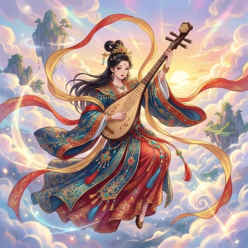古典中式梦幻,动漫风飘带,超现实主义飞天,琵琶乐舞,沙漠古建筑背景。