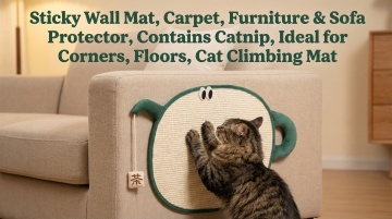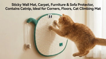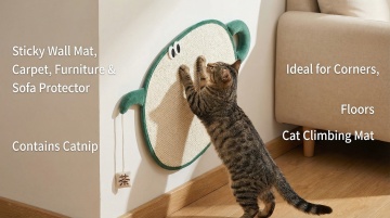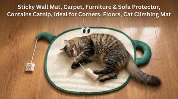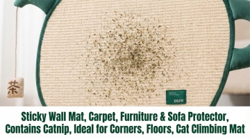以图中的猫抓垫为元素,粘性墙垫 地毯 家具 沙发保护垫 含猫薄荷 适用于角落 地板 猫咪攀爬垫,设计6张跟猫抓垫有关的图,比例 「16:9」,物体主体特征不变,语言是英语