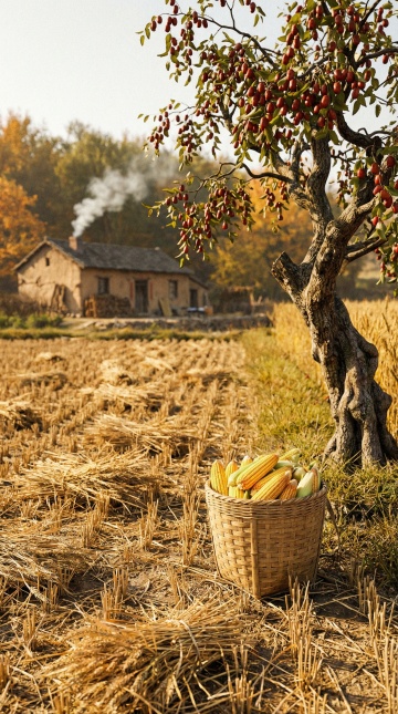 背景是层峦叠嶂的青绿色山脉,山间薄雾缭绕,远处田野呈现柔和的色块,阳光透过枝叶洒下斑驳的光影,整体色调温暖清新,画面充满丰收的治愈感