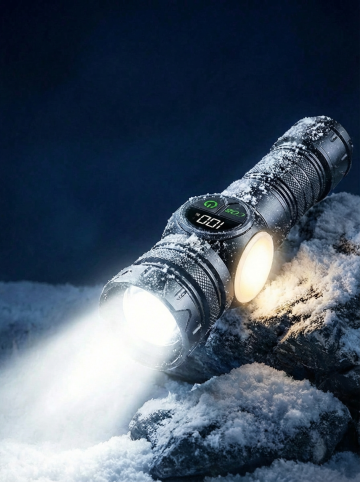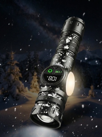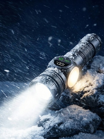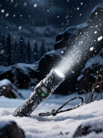 背景是夜晚森林中的地上,一支黑色战术手电筒的特写,一半的体积被雨水浸泡在水中(从地面泼溅而起,激起水花,水花晶莹剔透,折射着光线),背景是森林。