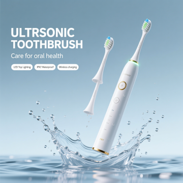 极简蓝调电动牙刷立于雪岛之上,映照冰湖倒影,融合科技感与微缩艺术风,展现清爽未来视觉。