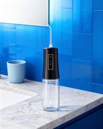 喜庆红绿配色,科技感水牙线置于礼盒中,重拟物风与塑料质感结合,双色设计凸显现代感,节日氛围浓厚。