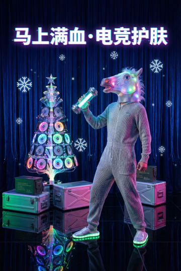 霓虹马头面具主唱穿漆皮针织外套,肩背“巨型电吉他精华”当脊柱,琴弦流光随节奏闪烁;舞台为三面台延伸T字,地板为镜面LED,圣诞树由吉他弦与激光龙扎成,礼盒是铝制军火箱,金箔彩带炮全场;顶部3D霓虹龙体字“马踏红馆·摇滚焕肤”,中国红星空幕+电光流苏,十万流明激光扫观众,港风热浪4K。,生成3张