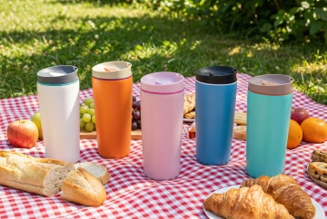 清新自然的户外场景中,四款简约金属质感保温杯以性冷淡风与轻拟物设计呈现,柔和色调搭配实景光影,传递舒适与高级感。