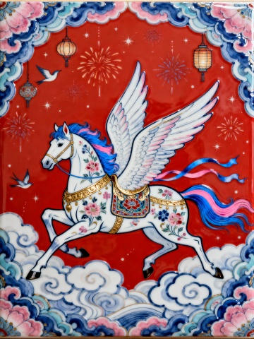 工笔风与重拟物结合,白驹腾云,飞天舞袖,红金背景衬托出浓郁的国潮风与喜庆感,融合岩彩质感与鎏金细节,呈现梦幻唯美的中式古典意境。