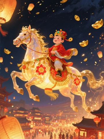 纯扁平风格,描边工笔插画, 主体是饰有福纹彩纹鞍具的金眼鎏金棕马(金色鬃毛带金属光泽,金眼柔和有神,呈静立衔宫灯姿态,周身萦绕淡金光晕,充满神圣感与温婉感)。背景为热闹的新春古街灯会,青石板路两侧挂满红灯笼与生肖灯,人流穿梭,浪涛元素化作金色光带环绕蹄边。点缀糖葫芦与剪纸元素,色调以棕、金、红为主,市井喜庆氛围拉满。