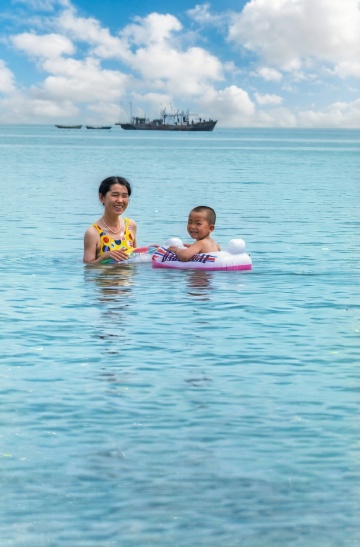 以超写实、超细致的16K单反质量修复图1照片。修复划痕、撕裂、噪点和模糊。保持自然肤色的同时增强鲜艳色彩。完美锐化头发和衣服细节。增添逼真光影和景深。专业级PS后期处理。高动态范围,超高清,逼真纹理,电影般仕后,清晰干净背景,完全还原和提升原照片面部亮度,让二人眼睛睁开,早8:00艳阳天,侧顺光,蓝天