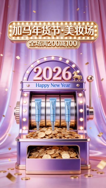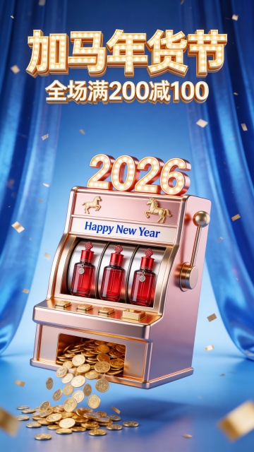 3D写实风,视觉中心是一台老虎机造型装置(悬空,正面视角,金属材质绿黄配色,机器上装饰“2026”立体数字、小金马,机器中部装饰“Happy New Year”蓝色小字,机器底部吐出大量金币),机器滚轮区放置3个图中商品。背景是湛蓝的天空和茶园,周围散落金色树叶。上方金色3D灯牌标题“加马年货节·饮料专场”,副标题3d金色小字“全场满200减100”。