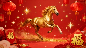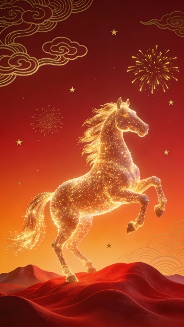 鎏金3D骏马踏金币,浮雕质感配祥云烟花,国潮风重拟物设计,喜庆梦幻尽显中式年味。