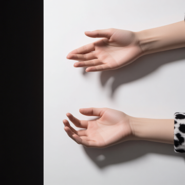 超写实风格女性手部特写,皮肤呈现细腻自然的浅米色,纹理清晰可见,中指与食指微微分开,指尖轻触向上,拇指与无名指自然弯曲,手掌内侧线条柔和,手腕部分自然延伸,整体姿态优雅舒展,光线从左上方柔和照射,形成淡淡的阴影,凸显手部立体感与肌肤质感,背景为纯白色,无任何多余元素,画面简洁干净,专注于手部的形态与细节表现。