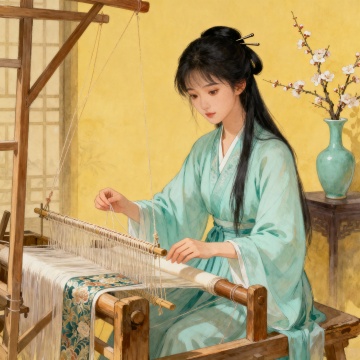 古典中式插画风,工笔细腻,水彩晕染,少女窗前刺绣,樱花纷飞,春日温馨浪漫,文艺优雅,尽显东方唯美意境。