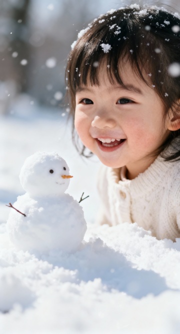 胶片风实景感,拟人风雪人与少女互动,毛发生长风飘雪细节,温馨可爱梦幻冬日场景。