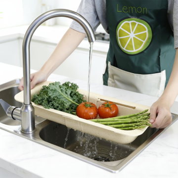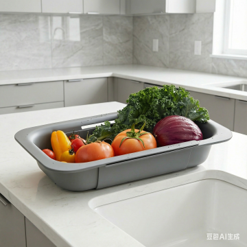 你是资深电商视觉设计师,请生成一张【电商主图】风格的产品图,用于电商详情页/投放素材。一张【塑料灰色可伸缩的沥水篮】的使用场景照片,要求不改变这款【灰色可伸缩的沥水篮】的样式和场景细节,消除图片中的水槽台面,保留图中的人物,动作,沥水篮以及沥水篮里的蔬菜水果。