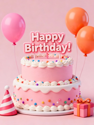 四个3D风格的生日蛋糕,每个蛋糕外观、样式和配色各不相同,均有白色奶油质地的蛋糕主体,表面装饰有不同颜色的奶油花纹,周围搭配不同颜色和大小的气球、蜡烛以及带有蝴蝶结的礼物盒,所有元素排列整齐,置于纯白色背景上,整体呈现出光滑细腻的3D材质感和明亮欢快的氛围。