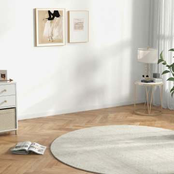 极简主义风格客厅3D渲染,浅灰色布艺沙发搭配米色靠垫,沙发前铺设浅灰色条纹地毯,旁边放置金属框架圆形小茶几,浅灰色墙面挂有简约装饰画,大面积落地窗配以白色半透明纱帘,窗外变换为自然绿植景观,整体色调以灰白为主,柔和自然光从窗户洒入,形成清晰的光影层次,地面为大块浅灰色瓷砖,空间干净通透,线条简洁流畅,营造宁静舒适的氛围。
