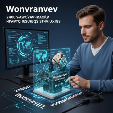赛博朋克风格的插头图标,插头造型设计为机械齿轮与电路板融合的未来科技形态,插头表面有霓虹蓝色和紫色的发光电路纹路,闪电符号变为带有故障艺术效果的动态光效,整体被一个由二进制代码流组成的圆形环绕,背景为深黑色带有网格纹理,图标边缘有轻微的辉光效果,呈现出高科技、未来感和能量感的视觉氛围。