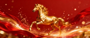 金色主色调背景,具有细腻的磨砂纹理与柔和的渐变光泽,右下角点缀闪烁的金色颗粒质感,整体呈现温暖而华丽的金属光泽感,融入中国风元素与万马奔腾的壮阔场景,马匹姿态昂扬、鬃毛飞扬,以流畅的线条勾勒出动态奔腾之势,背景可适当加入祥云纹、回纹等传统中国风装饰图案,保持整体金色调的和谐统一,营造出既具现代质感又不失古典韵味的磅礴氛围。