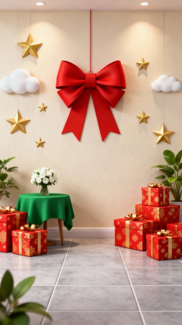 3D渲染风格的室内空间,整体采用温暖的橙红色调与柔和的米黄色相结合,顶部弧形结构与圆柱保持光滑的曲面设计,表面带有细腻的光泽感,地面呈现出温暖的木质纹理并具有清晰的反光效果,墙面为柔和的米黄色,带有纵向的细微条纹装饰,空间内分布着几个白色礼盒,礼盒上系着橙红色的蝴蝶结,部分礼盒堆叠放置在墙角,一盏嵌入式筒灯从顶部照射下来,在地面形成柔和的光影,整体氛围温馨而舒适,具有现代简约的设计感,光线柔和均匀,阴影过渡自然,空间宽敞明亮。