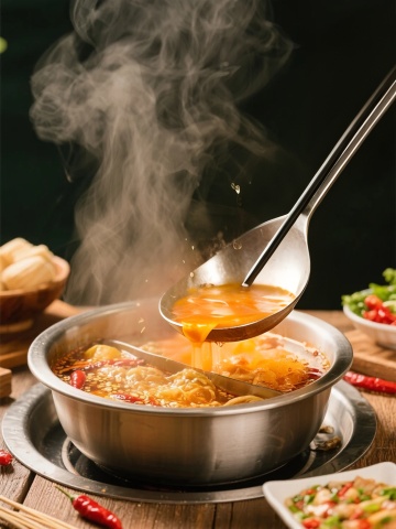 重拟物风呈现热辣沸腾的中式火锅,油光溢彩,蒸汽缭绕,辣椒与牛肚在光影中跃动,质朴木桌衬托实景感,如油画般浓郁。