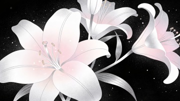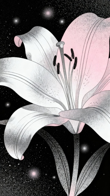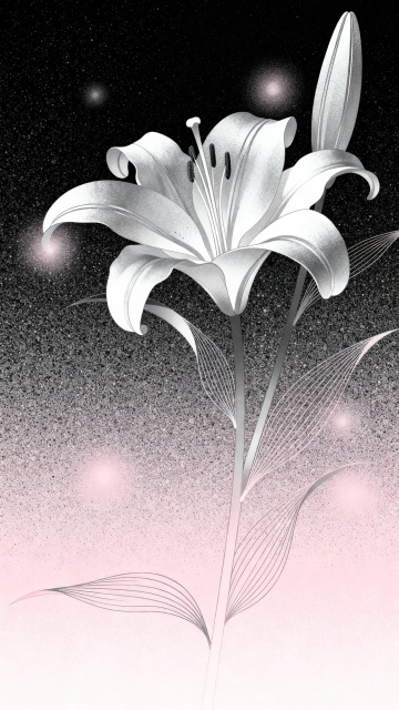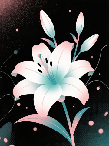 梦幻感插画风,双色渐变的优雅百合在虚拟自然中绽放,粒子点缀的暗夜背景营造唯美感。