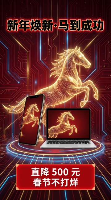 国潮风融合重拟物与霓虹灯元素,鎏金祥云环绕飞马跃动,中式建筑与科技家电交织,喜庆氛围中传递新春促销信息。