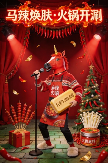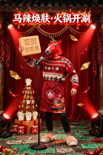 国潮风拟人马头形象,手持火锅底料与洁面皂,舞台灯光与辣椒元素营造喜庆综艺感,融合重拟物与霓虹灯风,节日氛围浓厚。