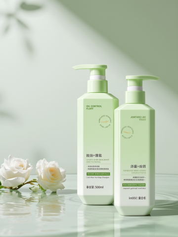 洗发水海报设计,两瓶深绿色透明液体洗发水瓶,搭配黑色按压泵头和白色标签,标签上有黑色文字与金色装饰细节,瓶身优雅放置于浅棕色木质树枝上。树枝下方是清澈湿润的水面,点缀着光滑石头,周围环绕着鲜活的绿色植物枝叶与根茎。整体采用清新自然的绿色调,柔和的侧光照明营造出宁静、有机、纯净的氛围,背景为渐变浅绿色。画面视觉层次清晰,以产品为绝对主体,光影效果细腻,水面呈现清晰的瓶身倒影,整体质感写实,设计简约自然,传达出天然植物萃取的产品特性。