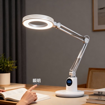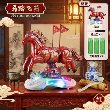 主体是摄影风格的戴着马头套的年轻男人形象(穿着时尚,戴着马的头套,不需要露出人脸,整体喜庆,充满新年的感觉)。他坐在书桌前看着台灯,主标题:“horse 发声”( 红色夸张字体 + 内嵌马蹄印图标),下方副标 “马住!双旦好物集”,两侧分别一句竖排的创意文案,左侧:0频闪护眼台灯;右侧:让孩子告别近视眼