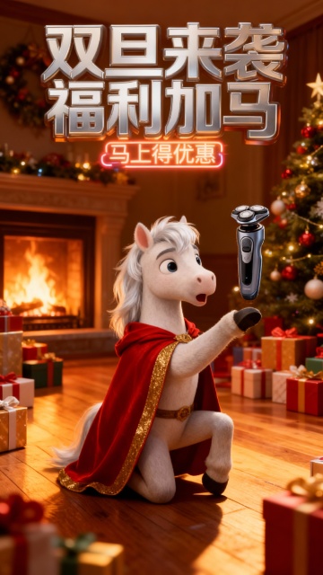 主体是摄影风格的戴着马头套的年轻男人形象(穿着时尚,戴着马的头套,整体喜庆,充满新年的感觉)。他坐在书桌前看着台灯,主标题:“horse 发声”( 红色夸张字体 + 内嵌马蹄印图标),下方副标 “马住!双旦好物集”,两侧分别一句竖排的创意文案,左侧:0频闪护眼台灯;右侧:让孩子告别近视眼