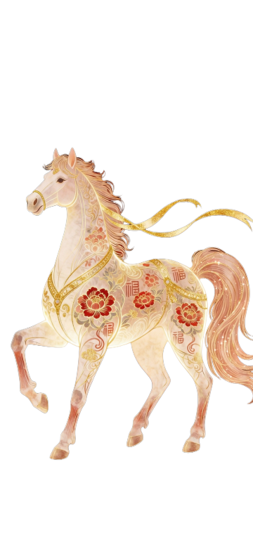 鎏金浮雕风白骏马,配以华丽珠饰与祥云花卉,红金背景尽显中式奢华与喜庆,国潮插画风中透出古典优雅之美。