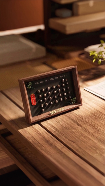 古朴雅致的中式书房场景,暖棕色调木质背景墙,右侧圆形镂空窗格投下斑驳光影,左侧有翠绿植物枝叶自然垂落,桌面上摆放着一个青瓷茶具套装,包括盖碗、公道杯和品茗杯,旁边放着一小罐茶叶和一个竹制茶则,整体光线柔和,营造出宁静悠远的东方禅意氛围,细节精致,质感温润,具有高度写实的摄影风格,突出传统器物的古朴韵味与自然肌理。