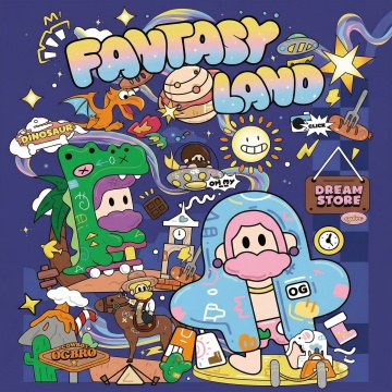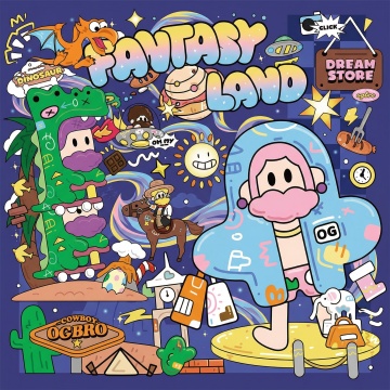 夸张的漫画风格设计,拼贴画,广告插图,复古风格,两个比例夸张的卡通形象的人物位于下方庆祝,上方有地球,飞船。人物周围环绕着各种图案和文字,包括烟花,云等元素,牛皮纸背景,超清