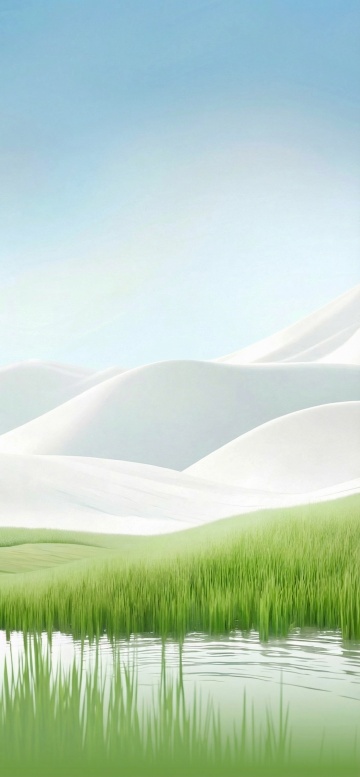 超写实风格的广阔草原景观,画面以明亮的蓝绿色调为主,天空占据上半部分,呈现清澈的淡蓝色,点缀着几朵蓬松的白色积云,阳光从云层间隙洒落,形成柔和的光线效果。前景是起伏的绿色草地,草叶茂密且富有层次感,呈现出深浅不一的绿色渐变,点缀着零星的白色小野花和几片嫩绿的叶子。远处的山丘轮廓柔和,与天空自然过渡,整体构图采用三分法,营造出开阔、宁静、生机勃勃的氛围,光影柔和,色彩和谐,细节丰富,具有强烈的空间纵深感和自然质感。