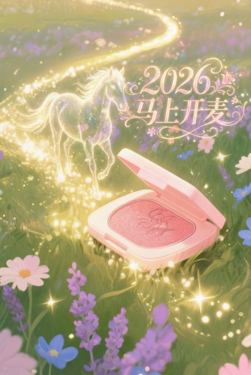 梦幻插画风,水彩质感融合粒子光效,虚拟自然场景中闪耀独角兽与腮红盒呼应“2026马上开麦”,清新柔美,甜蜜浪漫。