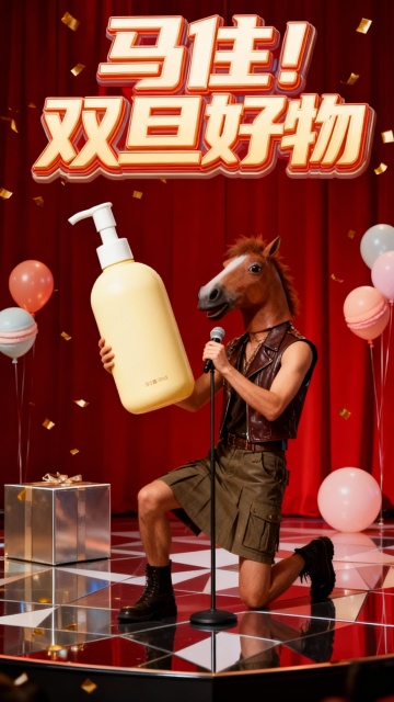 在聚光灯聚焦的华丽舞台上,一位戴着精制棕色皮革马头面具的年轻模特,身穿融合街头与高定元素的撞色套装,摆出一个充满张力与自信的姿势。她单手抱住一个被夸张放大的产品,另一只手则有力地握住面前一个黑色金属立麦的支架。舞台上精心布置了堆叠的丝带礼盒、反光的装饰彩球、挂满彩灯和小礼物的圣诞树以及几枚散布的鎏金蛋。画面中,无数细碎的金色彩带从上方飘落,在空中缓缓舞动。舞台深处是垂坠感十足的深红色幕布,幕布前方悬浮着巨大而炫目的3D立体艺术字“马住!双旦好物”,字体采用了液态金属与霓虹光影结合的效果,形态流动而富有创意。舞台地面是光滑的墨绿色,反射着上方灯光,整体构图充满动感与节日狂欢气息,完美诠释了综艺宣传海报的视觉风格。