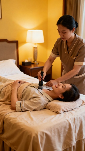 温暖柔和的自然光透过竹帘洒入,营造出宁静舒适的氛围。一位专业的按摩师正手持白色陶瓷小壶,将金黄色的按摩精油缓缓滴落在顾客的背部。顾客趴在铺着洁白毛巾的按摩床上,背部肌肤在阳光下泛着健康的光泽。背景是简约雅致的木质装饰和绿色植物,整体环境充满自然、放松的感觉,光线柔和温暖,突出精油滴落的瞬间和肌肤的质感,营造出高端SPA的舒适体验。