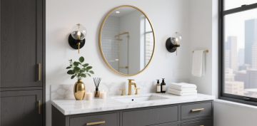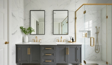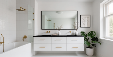 一个明亮整洁的现代厨房,采用简约优雅的设计风格,以白色为主色调,搭配黄铜色金属装饰细节。厨房整体呈现出温馨舒适的氛围,阳光透过百叶窗洒入,在白色橱柜和大理石台面上形成柔和的光影效果。白色的橱柜带有黄铜色的圆形拉手,上方的吊柜和下方的地柜组合提供了充足的储物空间。大理石台面光滑洁净,带有自然的灰色纹理。台面上有一个双槽不锈钢水槽,搭配黄铜色的水龙头。水槽旁边的金属桶里插着木质的锅铲和汤勺。墙面安装着黄铜色的挂杆,上面挂着各种木质和金属材质的厨房用具,包括勺子、铲子等。挂杆上方的白色搁板上摆放着不锈钢和玻璃材质的储物罐,里面装着各种香料和食材。台面上还摆放着一个白色的盘子,里面放着几块叠在一起的三明治,旁边还有一盘色彩鲜艳的沙拉。整体构图采用了三分法,光线从左侧窗户进入,营造出明亮通透的感觉,细节丰富,质感细腻,展现出干净利落的现代厨房设计感。