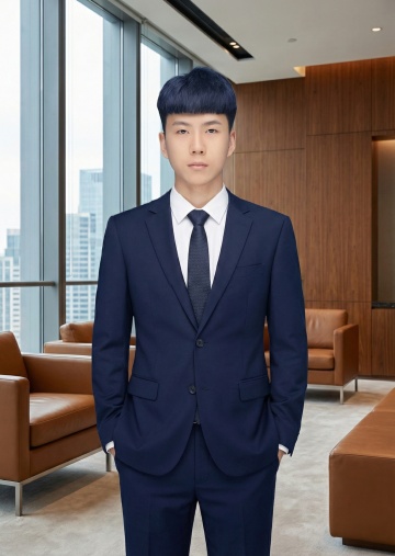 一位年轻亚洲男性,身着剪裁合体的黑色西装,内搭白色衬衫,系着黑色领带,左手自然插在西装裤口袋,右手轻握西装前襟,面带温和微笑,姿态自信挺拔,背景为纯白色,整体呈现清晰、专业、正式的商业人像摄影风格,光线均匀柔和,突出西装的挺括质感与人物的精神面貌。