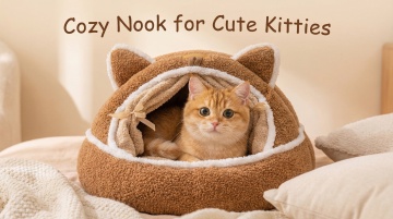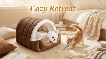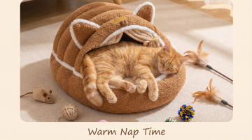 以图中的猫窝为元素,可爱安全的猫窝,温暖柔软,设计6张跟猫窝有关的图,物体主体特征不变,英语,比例 「16:9」「图片1」