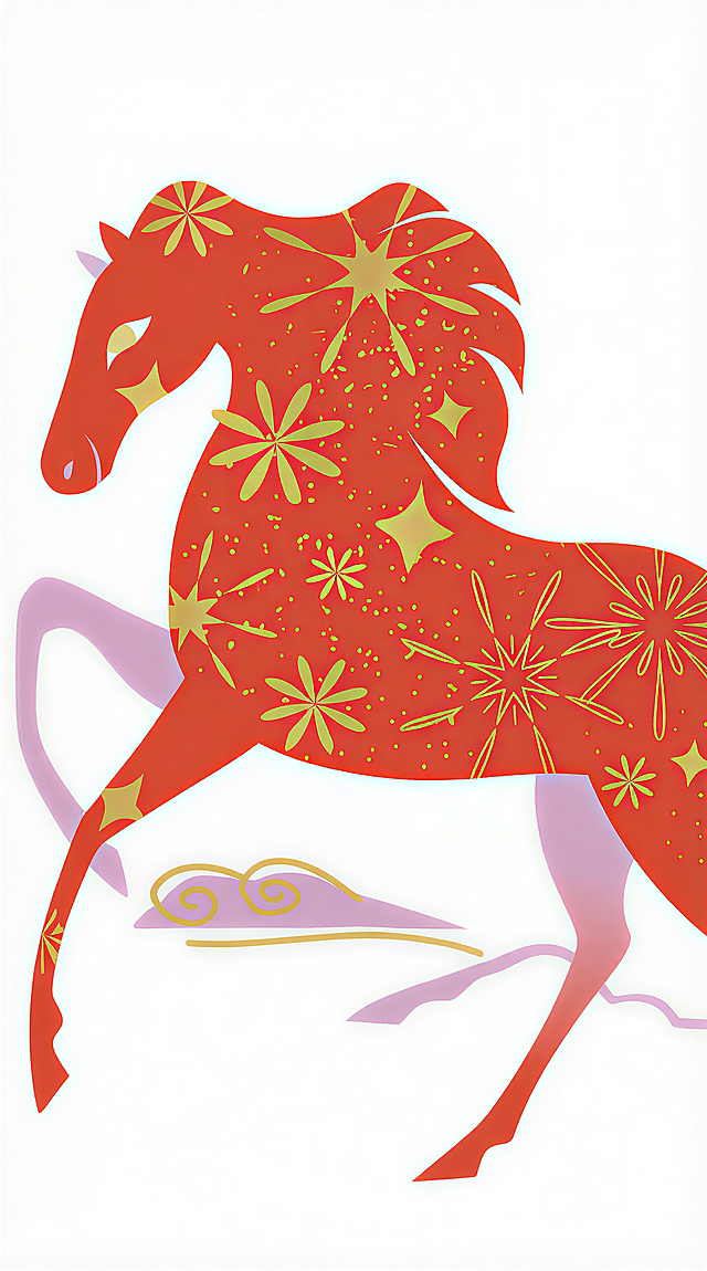 剪纸风与皮影风融合的中式插画,马身饰以民族纹样,复古色调,呈现传统节日喜庆氛围。详情