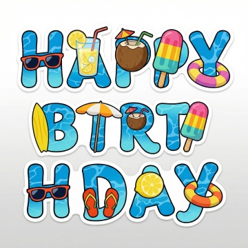卡通手绘风格生日主题设计,白色纯色背景,上方悬挂彩色波浪形彩带和蓝色三角旗装饰,中央是立体效果的“HAPPY BIRTHDAY”字母,字母采用粉色、黄色、蓝色等明亮色彩填充,边缘有白色描边,下方散落彩色圆点、线条和闪电形状装饰元素,整体画面活泼欢快,色彩明快,充满童趣,图形元素排列错落有致,视觉层次清晰,符合生日庆祝的欢乐氛围。