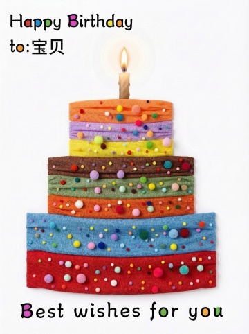 纯黑色线条绘制的三层生日蛋糕插画,顶层有一根点燃的蜡烛,每层蛋糕边缘有滴落状奶油装饰,蛋糕下方环绕着优雅的手写体"Happy Birthday"文字,文字周围点缀着星星和卷曲的丝带装饰,整体风格为简约卡通手绘,线条流畅自然,保持纯色背景,变换为波普艺术风格,增加鲜艳的色块填充和粗黑轮廓线,文字采用更具装饰性的艺术字体,保留原有蛋糕和元素布局但赋予更强烈的视觉对比和现代感。